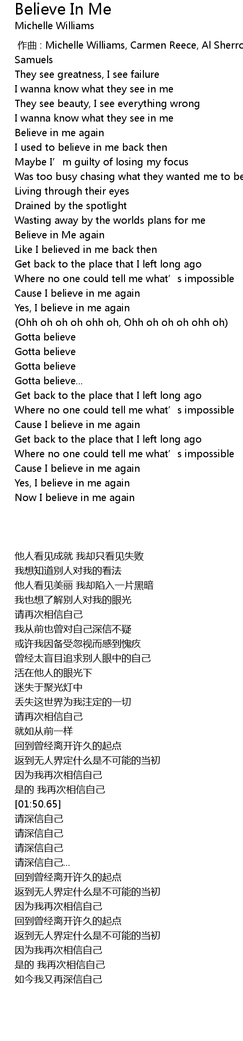 | [01:08.34] | Believe in Me again |