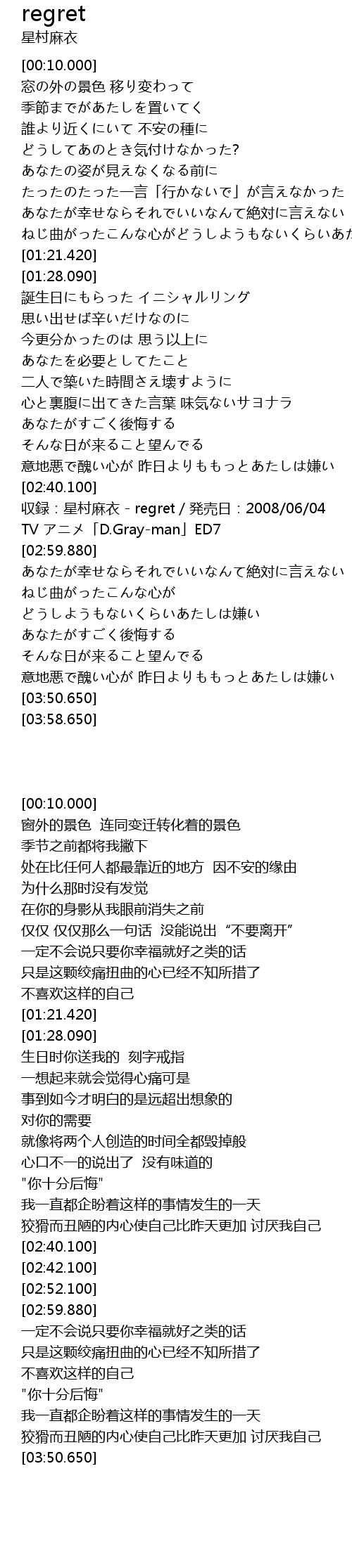 | [02:42.100] | 収録:星村麻衣 - regret/発売日:2008/06/04 |