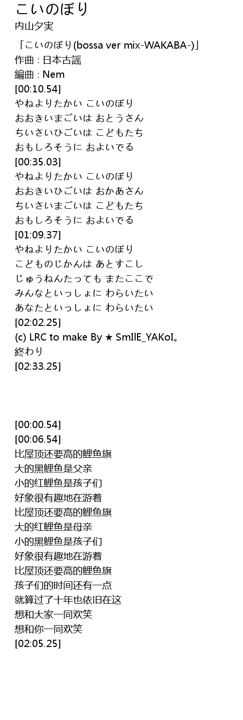 | [00:00.54] | 「こいのぼり(bossa ver mix-WAKABA-)」 |