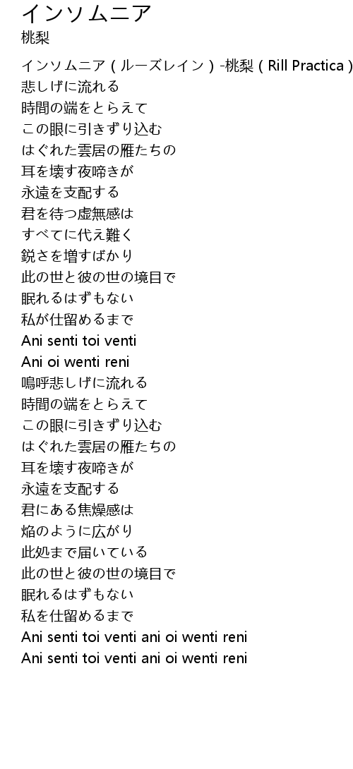 | [00:00.185] | インソムニア(ルーズレイン)-桃梨(Rill Practica) |