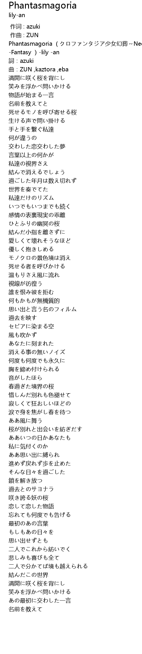 | [00:00.00] | Phantasmagoria (クロファンタジア少女幻葬~Necro -Fantasy )-lily -an |