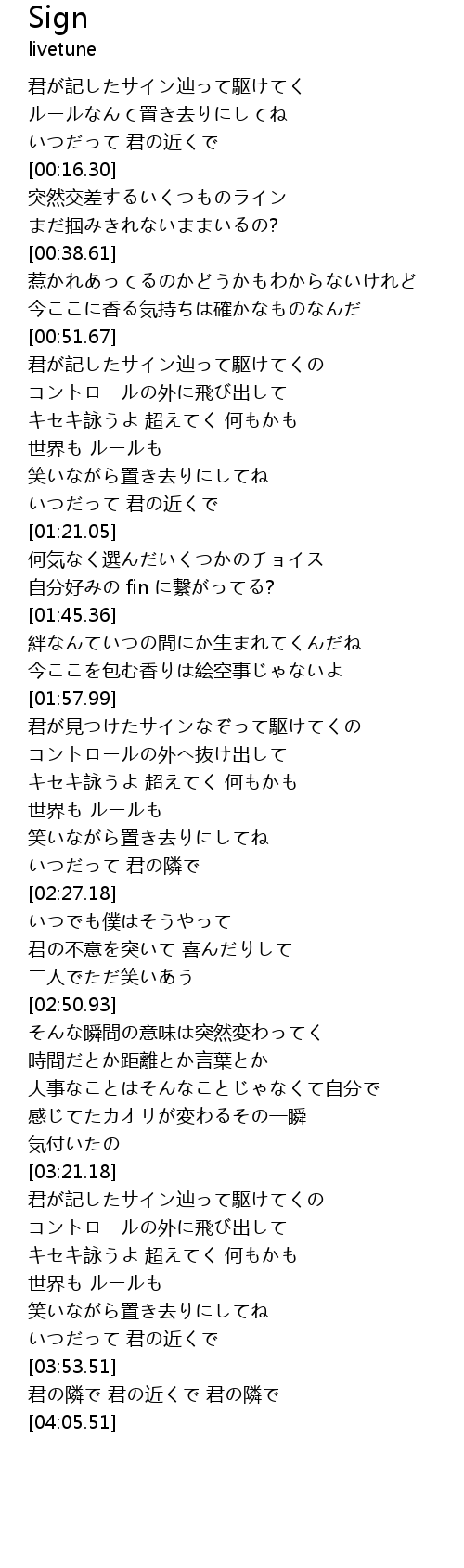 | [00:00.00] | 君が記したサイン辿って駆けてく |