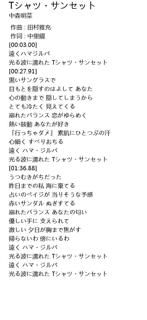 | [01:22.91] | 光る波に濡れた Tシャツ・サンセット |