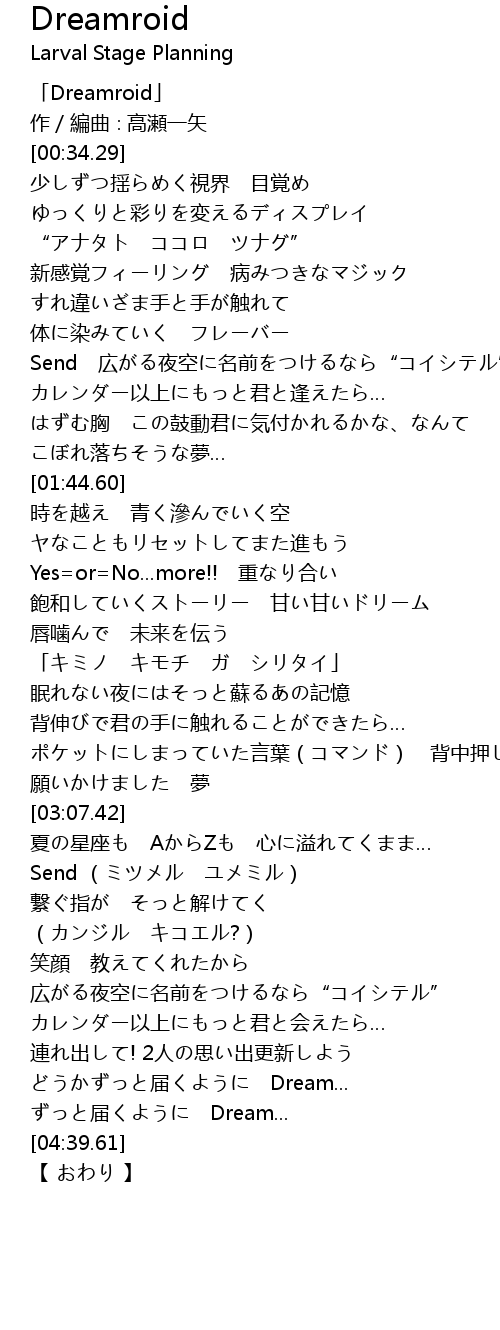 | [02:17.63] | 飽和していくストーリー 甘い甘いドリーム |