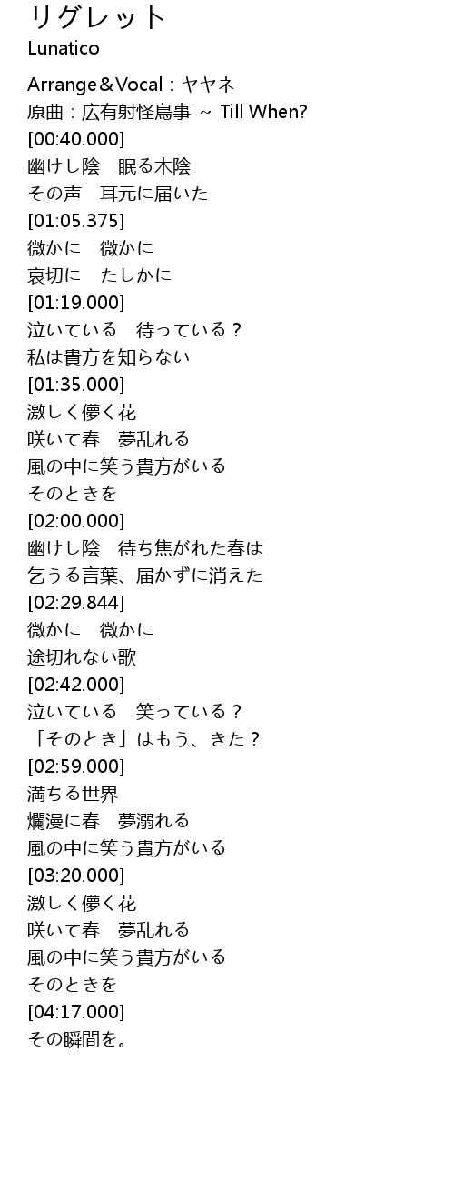 | [00:20.000] | 原曲:広有射怪鳥事 ~ Till When? |