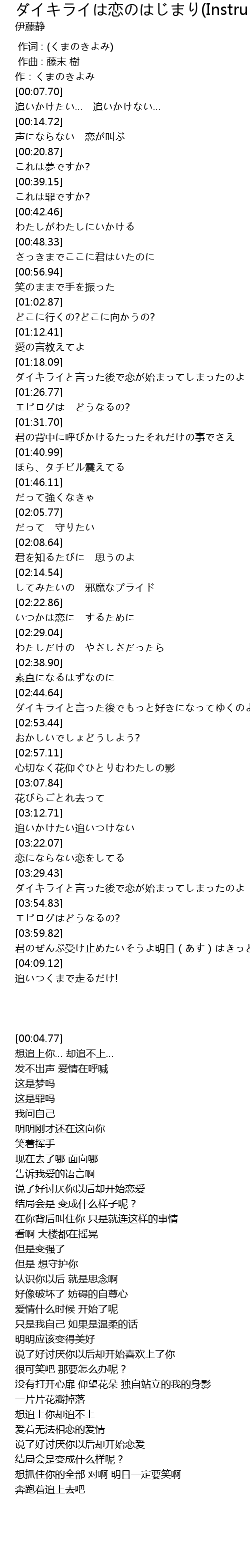 | [03:47.28] | ダイキライと言った後で恋が始まってしまったのよ |