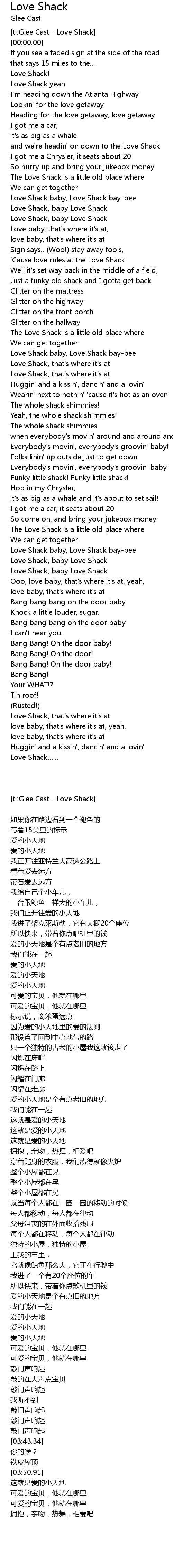 | [03:03.93] | Love Shack, baby Love Shack |