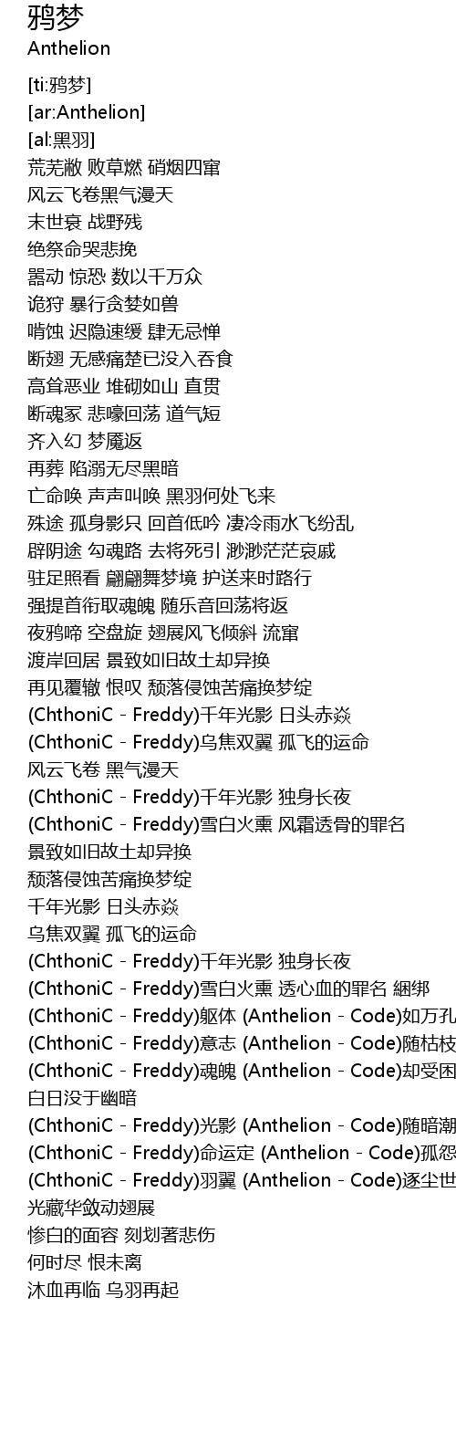 | [05:11.40] | (ChthoniC - Freddy)意志 (Anthelion - Code)随枯枝腐烂 |