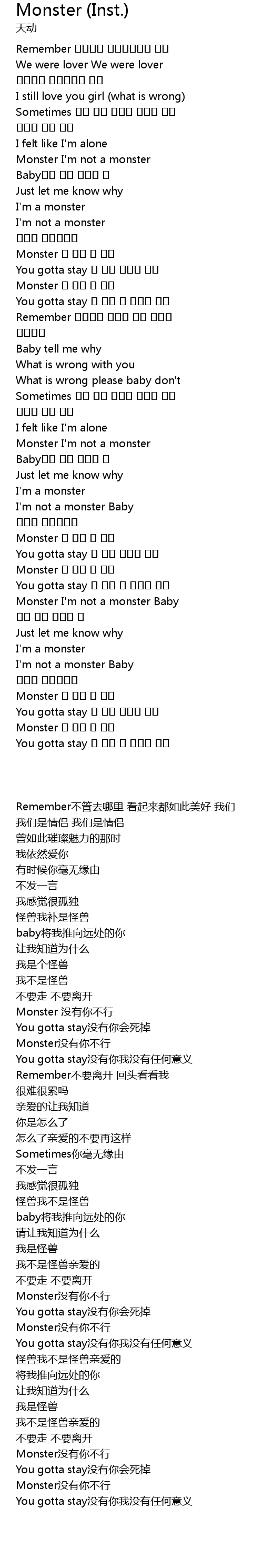 | [03:04.53] | Monster 너 없는 난 안돼 |