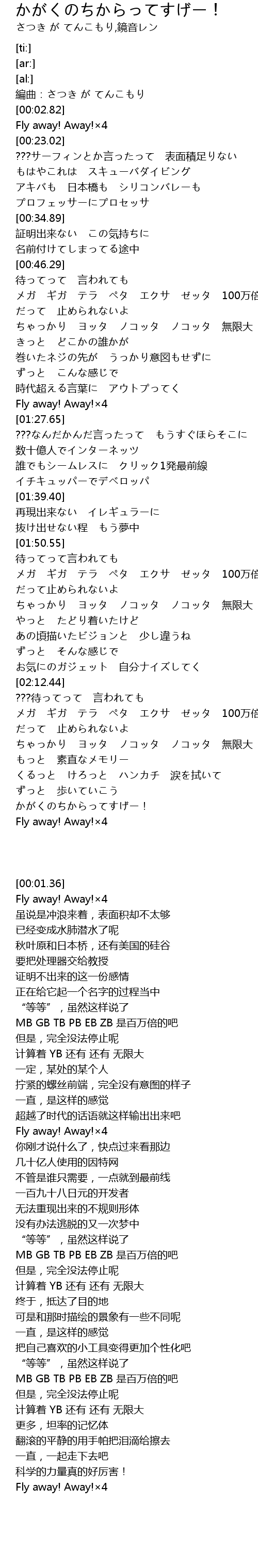 | [02:36.72] | メガ ギガ テラ ペタ エクサ ゼッタ 100万倍でしょ |