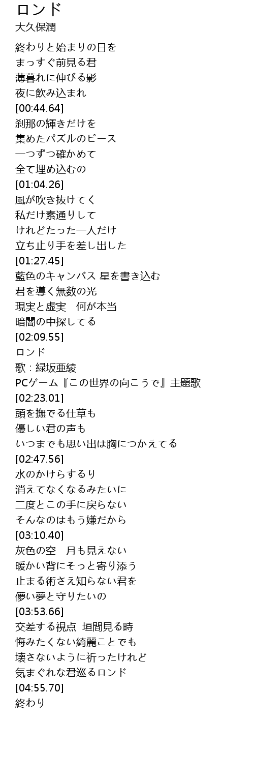 | [02:17.61] | PCゲーム『この世界の向こうで』主題歌 |