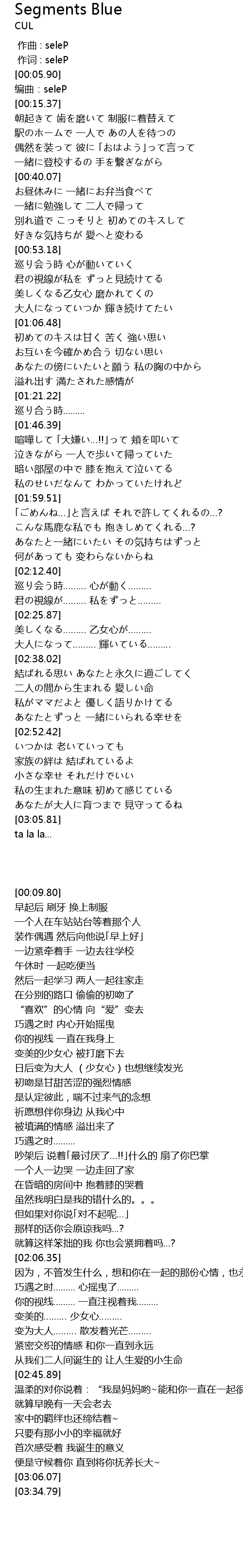 | [00:46.91] | 別れ道で こっそりと 初めてのキスして |