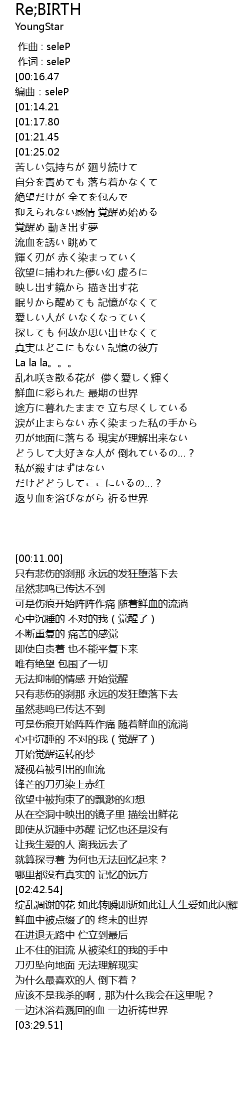 | [00:36.31][01:21.45] | 傷跡が疼きだす 鮮血と共に流れて |