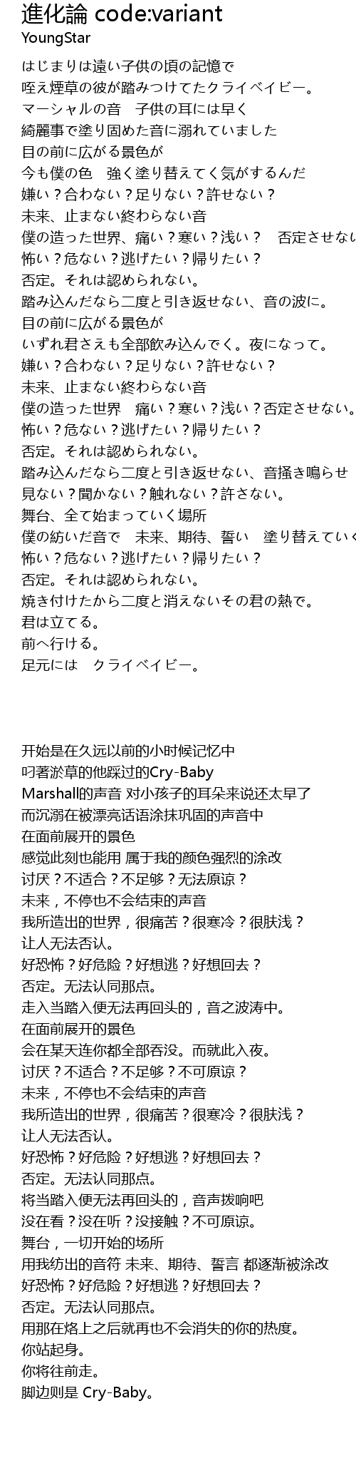 | [00:29.75] | 咥え煙草の彼が踏みつけてたクライベイビー。 |