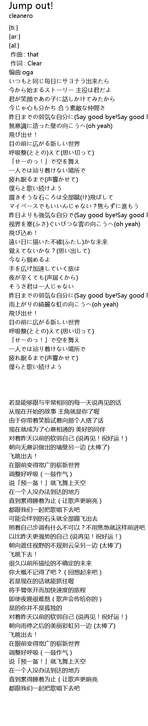| [03:19.79] | zuó rì ruò qì zì fēn Say good bye! Say good luck! |