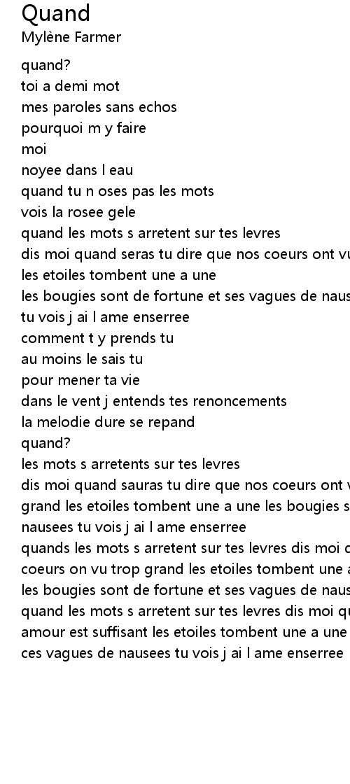 quands les mots s arretent sur tes levres dis moi quand sauras tu dire que nos coeurs on vu trop grand les etoiles tombent une a une |