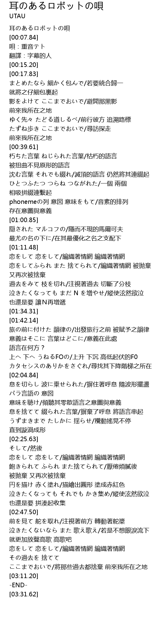 | [00:56.57] | phonemeの列 意図 意味をもて/音素的排列 存在意圖與意義 |