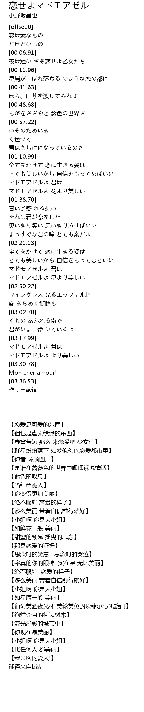 | [03:22.73] | マドモアゼルよ より美しい |