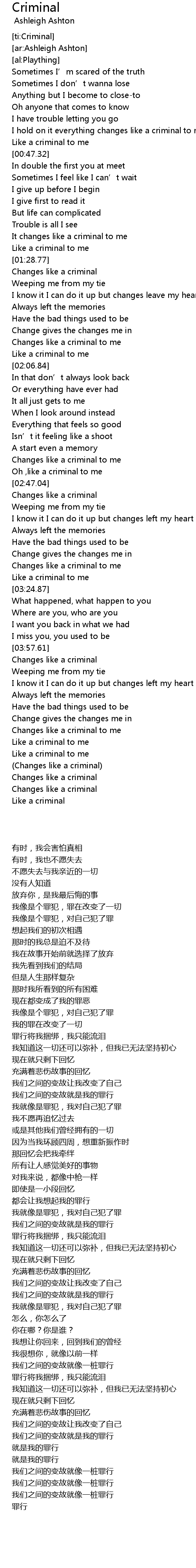 | [00:33.29] | I hold on it everything changes like a criminal to me |