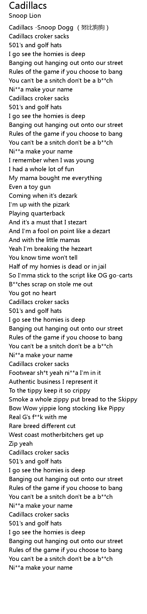 | [00:00.00] | Cadillacs -Snoop Dogg (努比狗狗) |