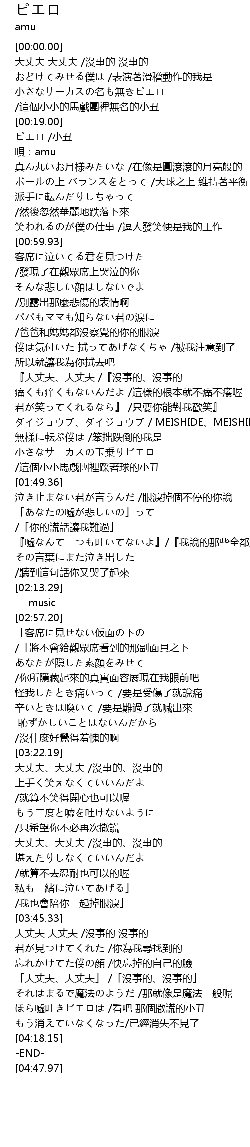 | [00:10.83] | 小さなサーカスの名も無きピエロ /這個小小的馬戲團裡無名的小丑 |