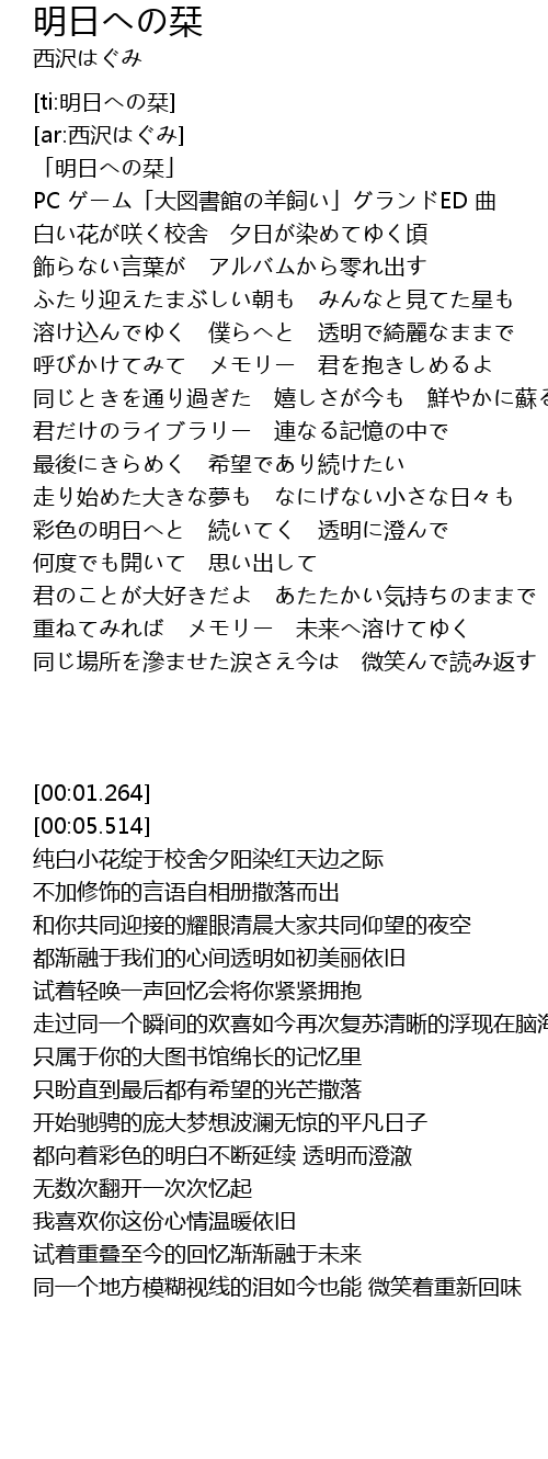 | [00:01.264] | 「明日への栞」 |
