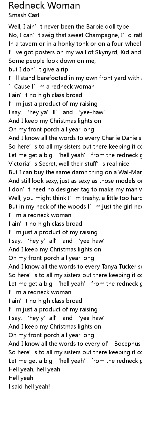 | Let me get a big ‘hell yeah’ from the redneck girls like me, hell yeah | |