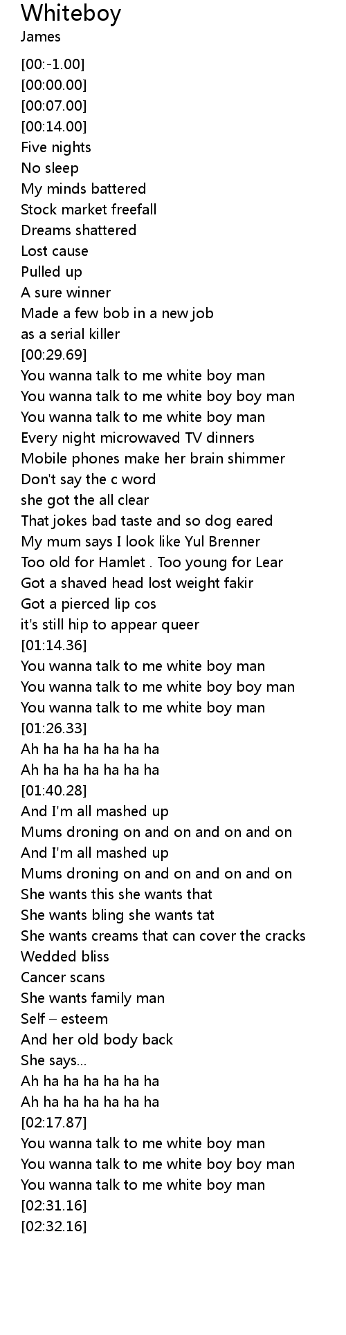 | [02:23.03] | You wanna talk to me white boy boy man |