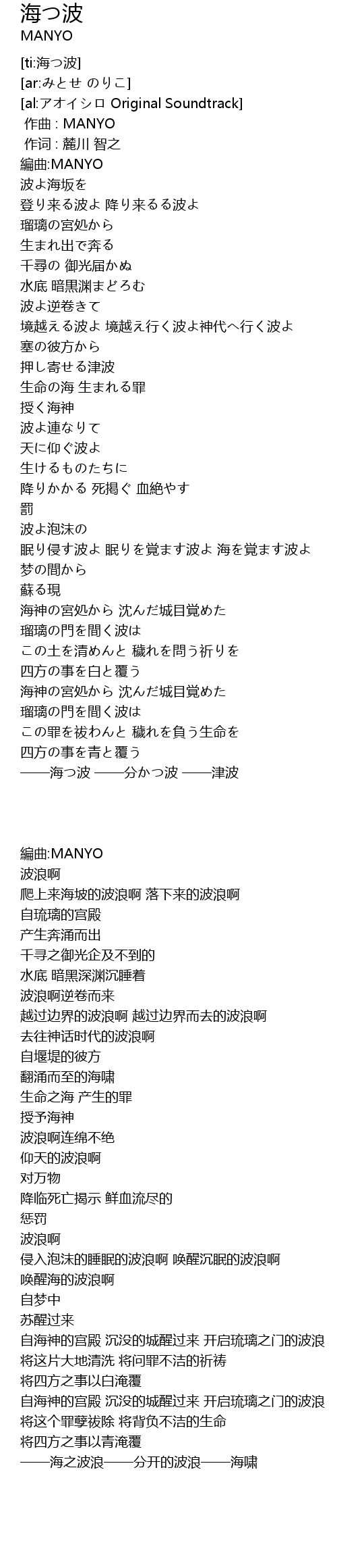 | [02:11.30] | 眠り侵す波よ 眠りを覚ます波よ 海を覚ます波よ |