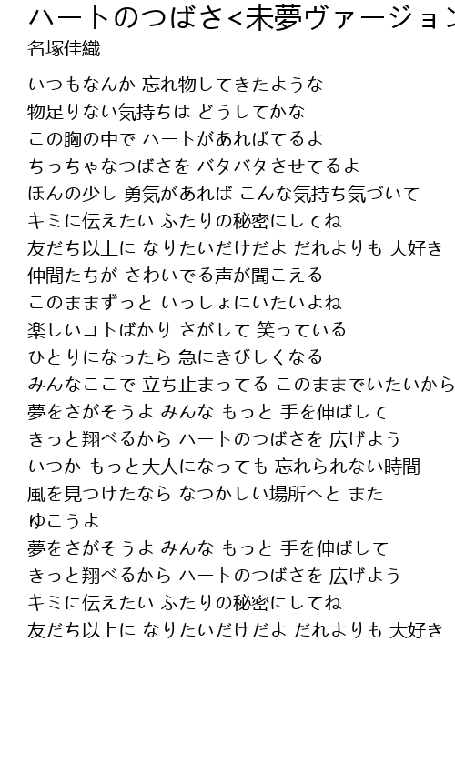 | [02:01.7] | きっと翔べるから ハートのつばさを 広げよう |
