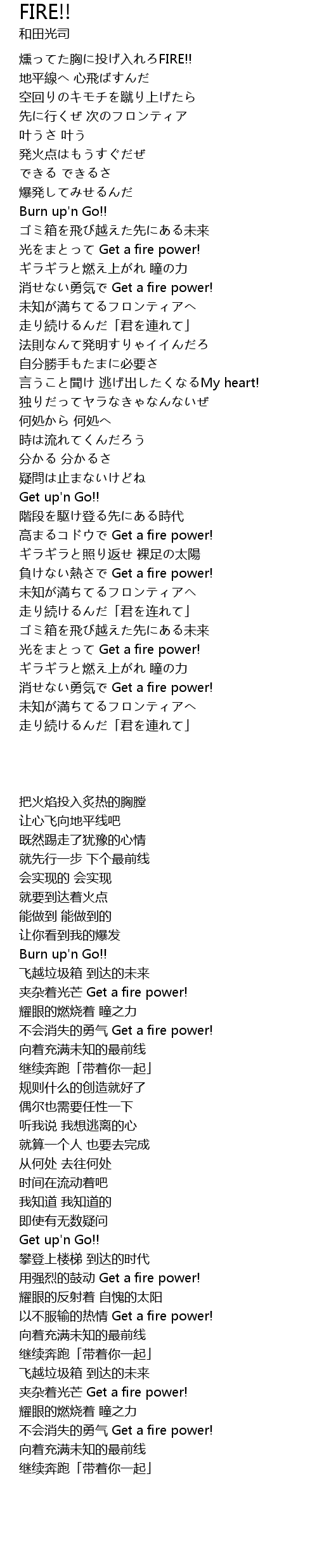 | [00:18.950] | 燻ってた胸に投げ入れろFIRE!! |