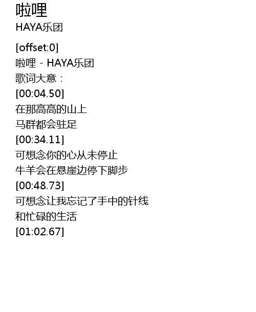 | [00:00.86] | 啦哩 - HAYA乐团 |
