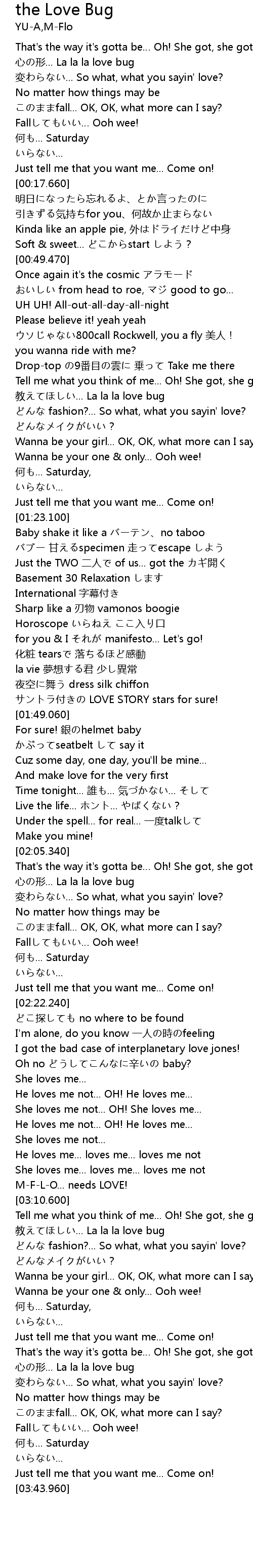 | [01:08.380] | 教えてほしい... La la la love bug |