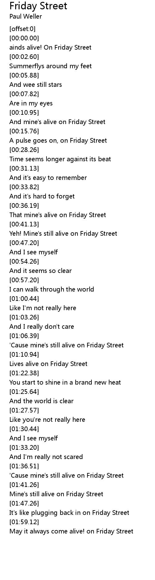 [01:38.94] 'Cause mine's still alive on Friday Street