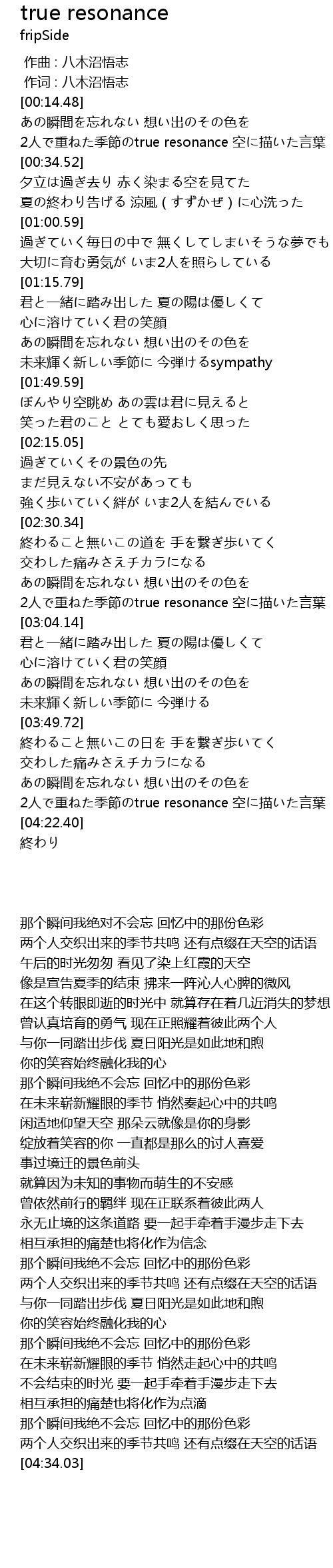 | [02:53.61] | 2人で重ねた季節のtrue resonance 空に描いた言葉 |
