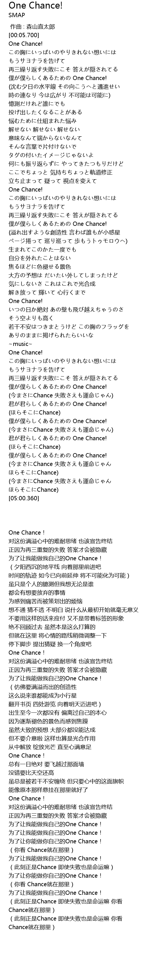 | [01:55.360] | 僕が僕らしくあるための One Chance! |