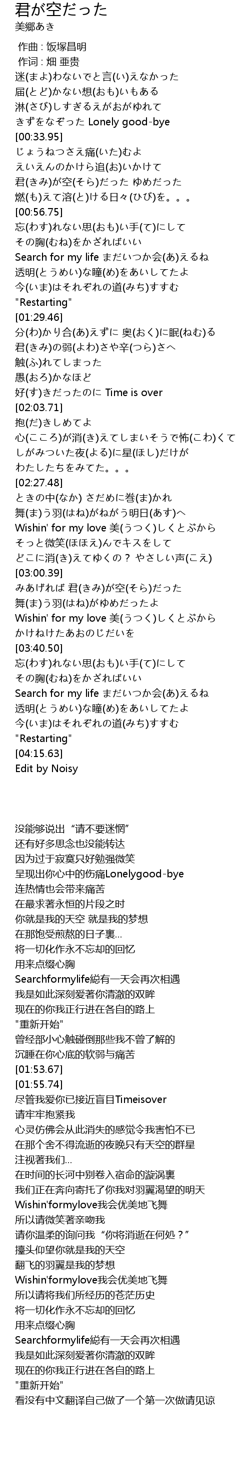| [00:45.99] | 君(きみ)が空(そら)だった ゆめだった |