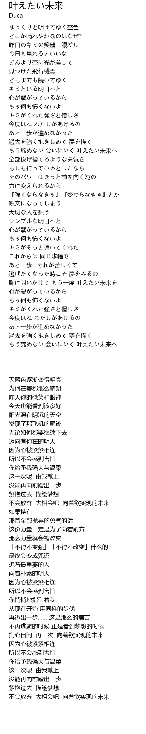 | [01:23.80] | もう諦めない 会いにいく 叶えたい未来へ |