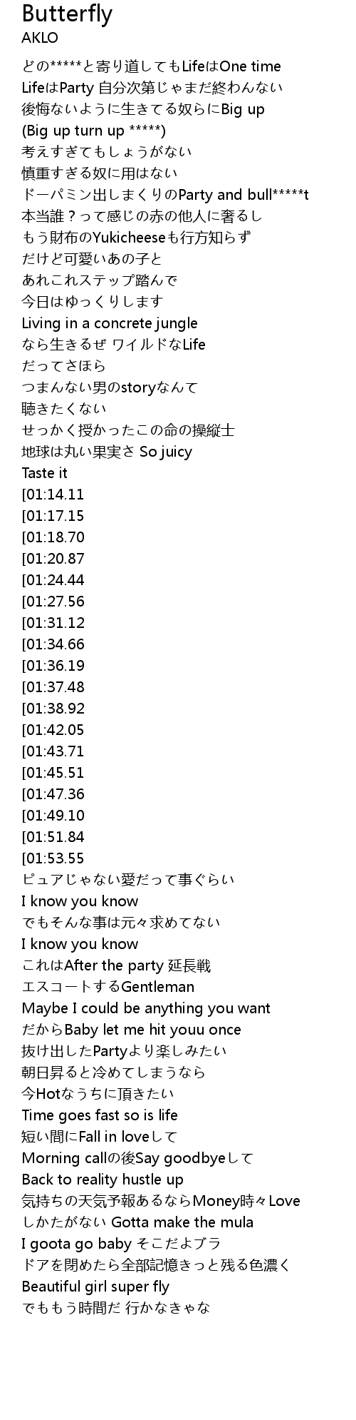 | [03:16.42][01:49.10] | fēi Butterfly guǎng Sky |