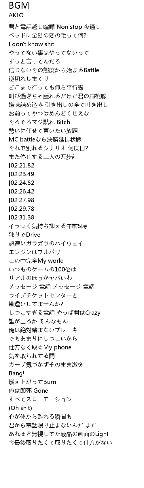 | [00:26.85] | そろそろマジ黙れ Bitch |