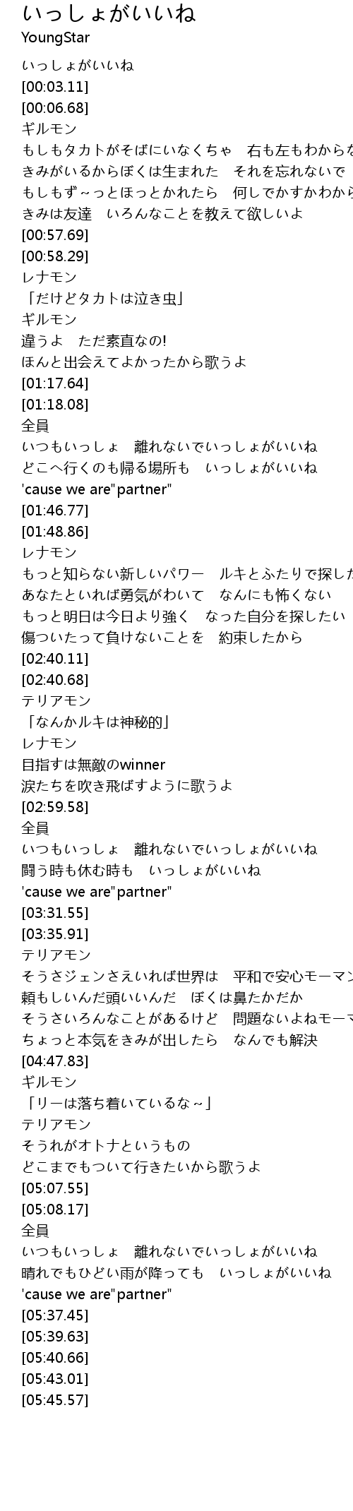 | [03:02.52] | いつもいっしょ 離れないでいっしょがいいね |