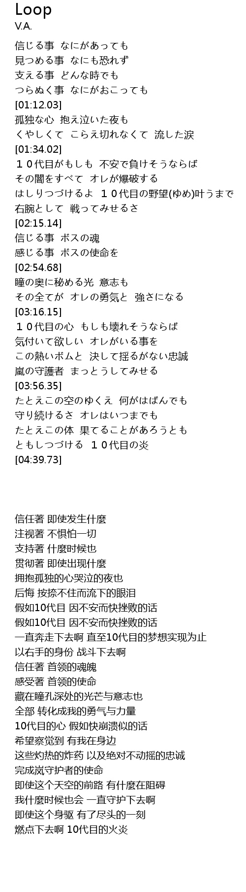 | [01:54.27] | はしりつづけるよ 10代目の野望(ゆめ)叶うまで |