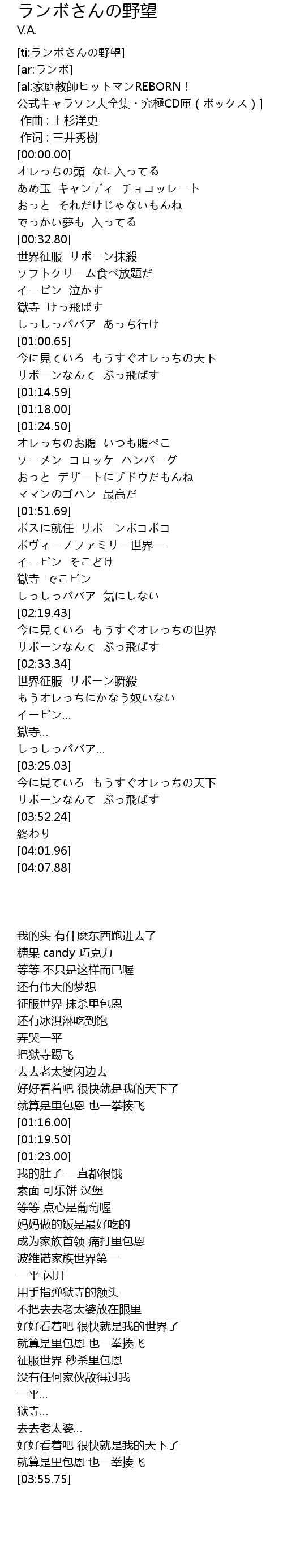 | [00:34.65] | 世界征服 リボーン抹殺 |