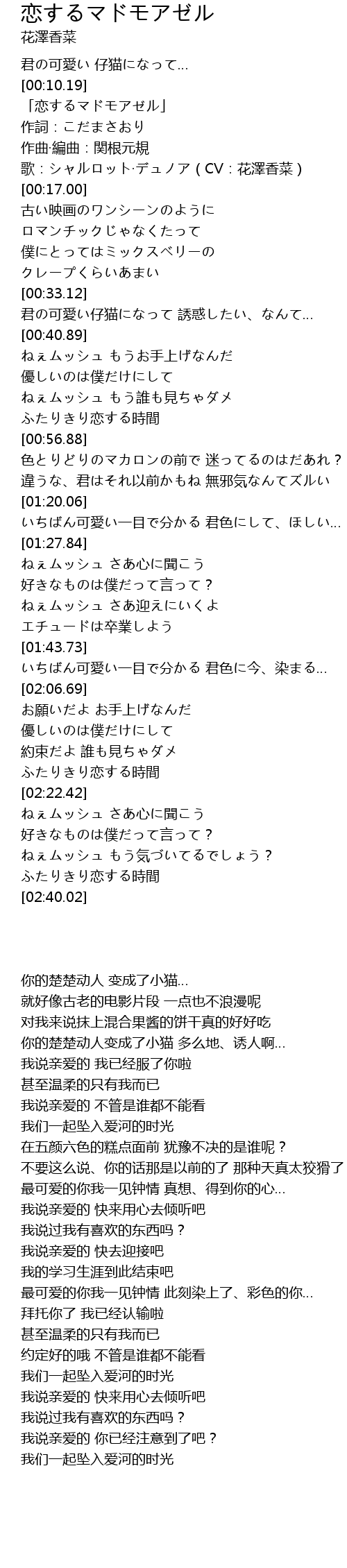 | [00:33.31] | 你的楚楚动人变成了小猫 多么地、诱人啊… |