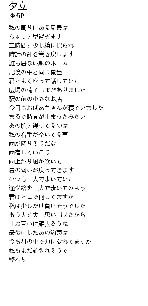 | [00:13.84] | 二時間と少し箱に揺られ |