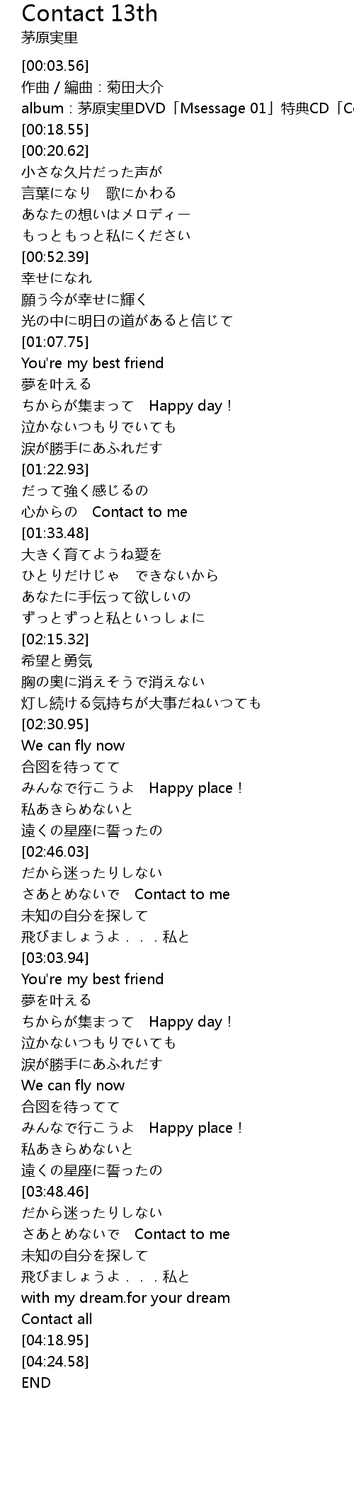| [00:15.72] | album:茅原実里DVD「Msessage 01」特典CD「Contact 13th」 |