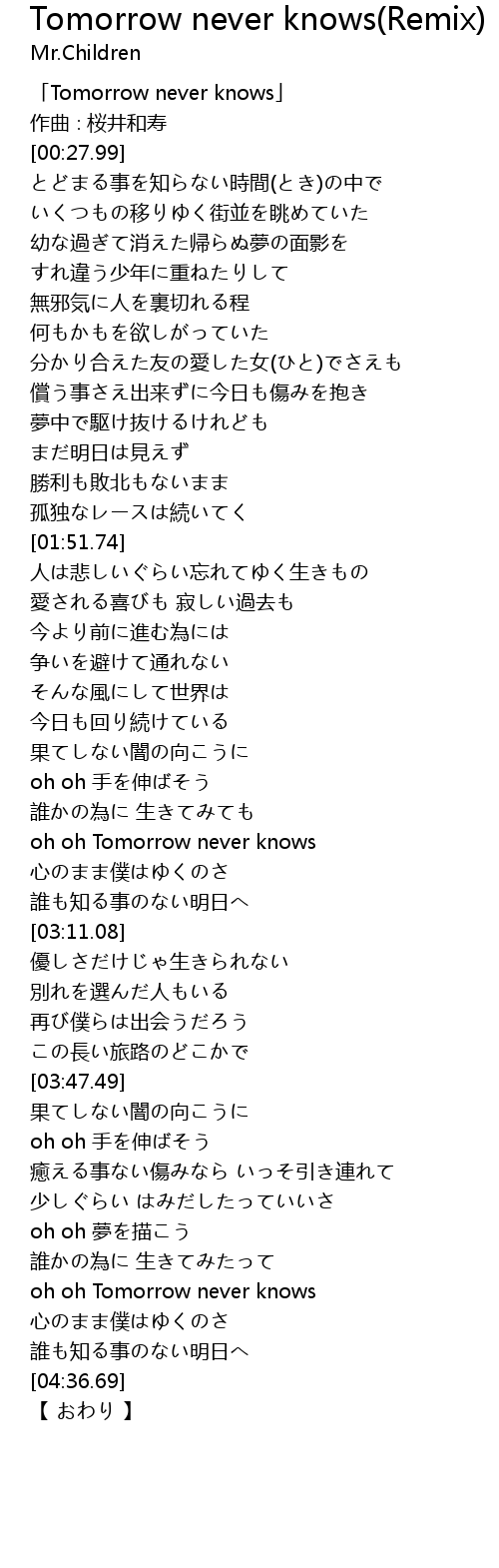 | [00:01.99] | 「Tomorrow never knows」 |