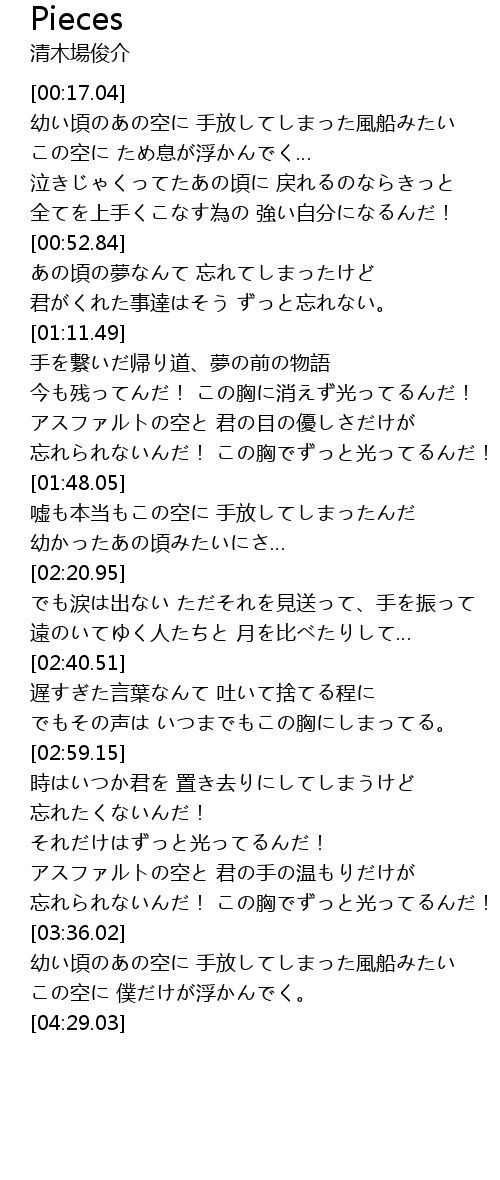 | [00:18.34] | 幼い頃のあの空に 手放してしまった風船みたい |