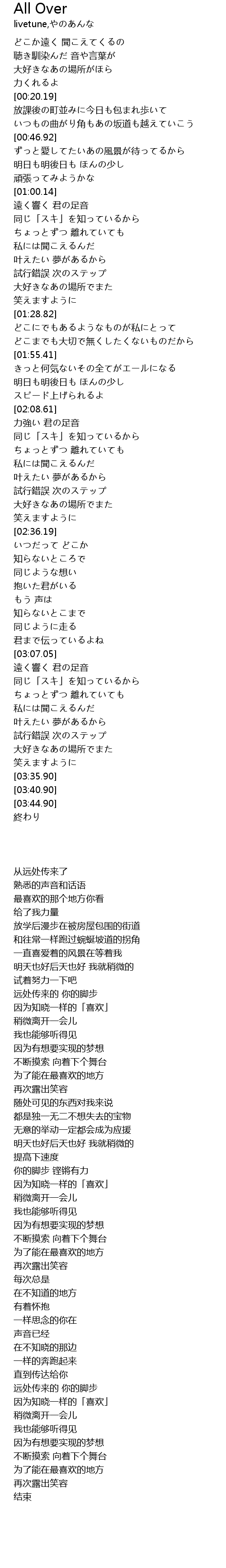 | [00:41.29] | いつもの曲がり角もあの坂道も越えていこう |