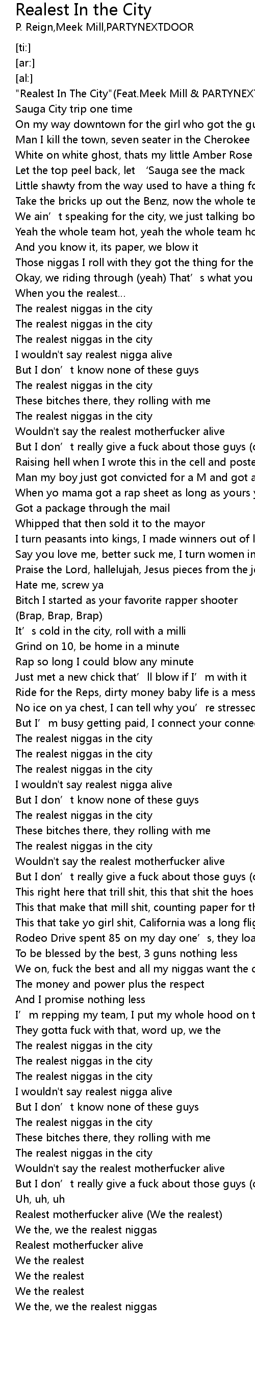 | [00:00.00] | " Realest In The City" Feat. Meek Mill PARTYNEXTDOOR |